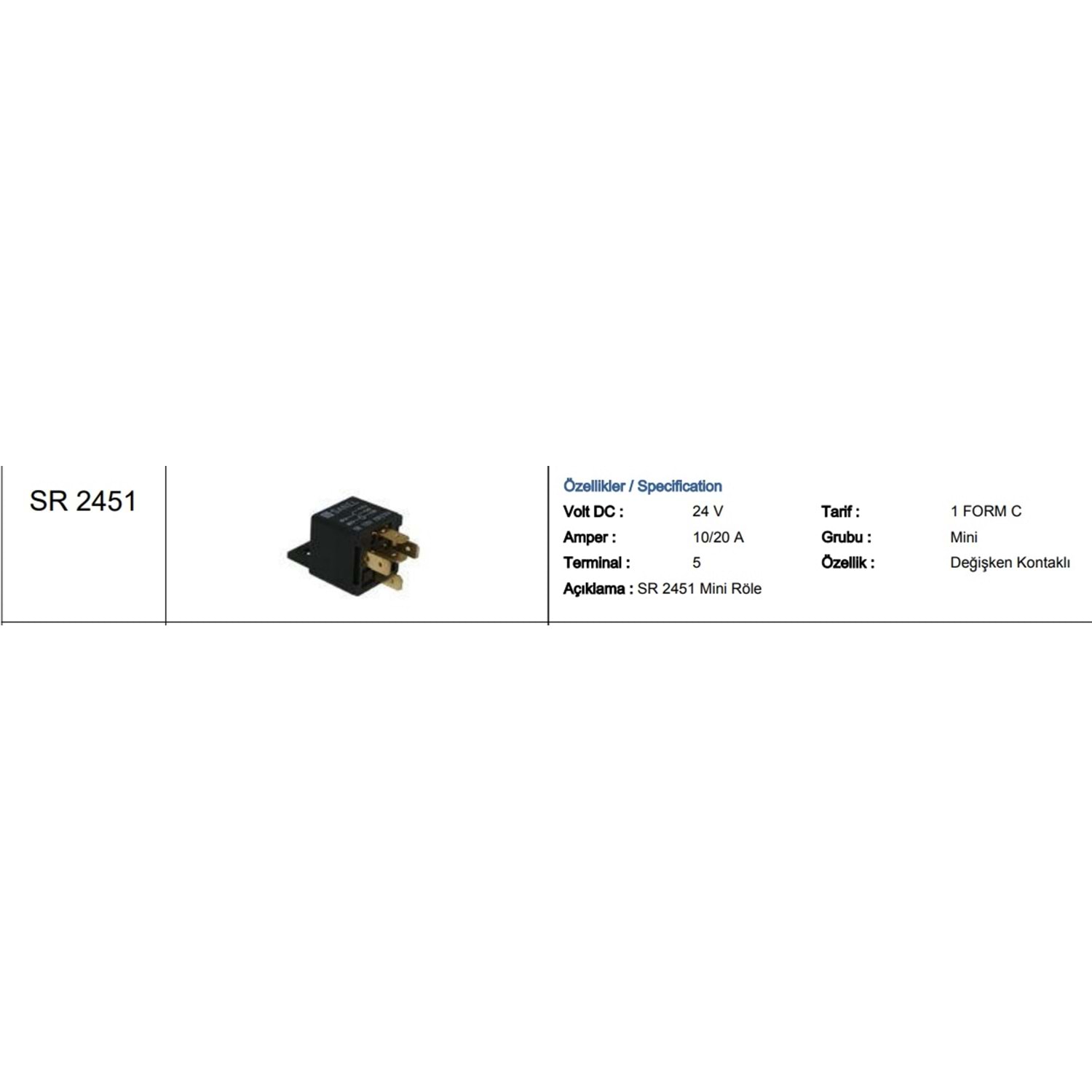 24V MİNİ ROLE 20/10A 5 UÇLU 2 PLATİNLİ