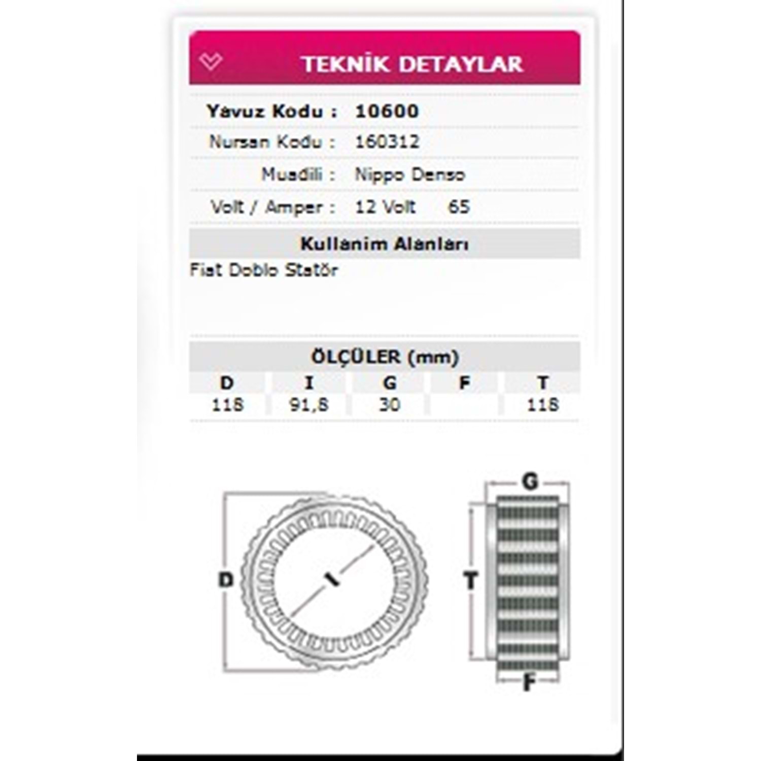 ALT STATOR FIAT DOBLO 12V 65A 160312
