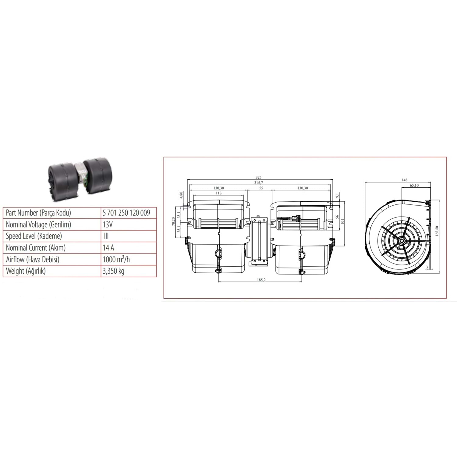 12V ÇİFTLİ KOMP 325MM 1000M3/H ÜÇ DEV DRÇ 72240018