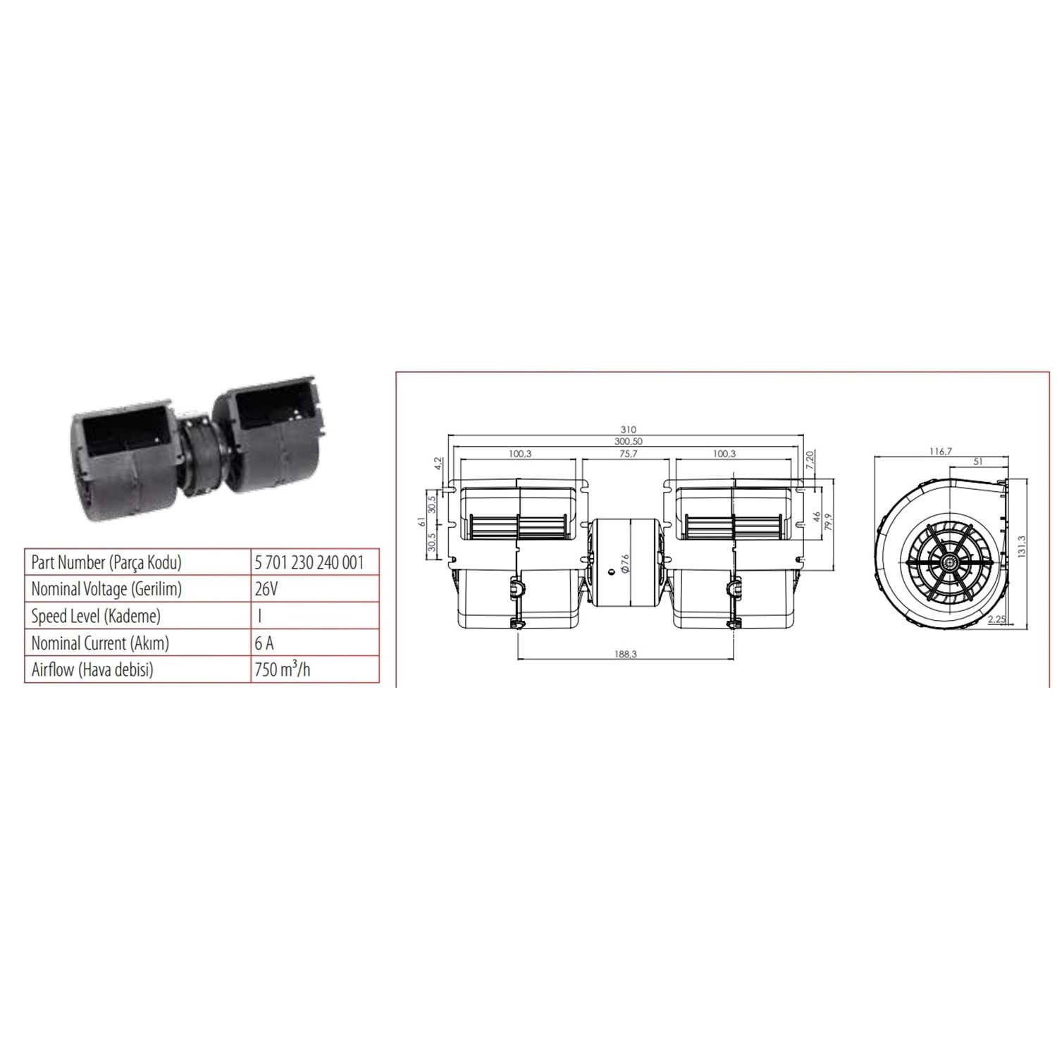 24V Y.M.KÜÇ. ÇİFT BLW.ÜNITE 750 M3/H TEK 71230002