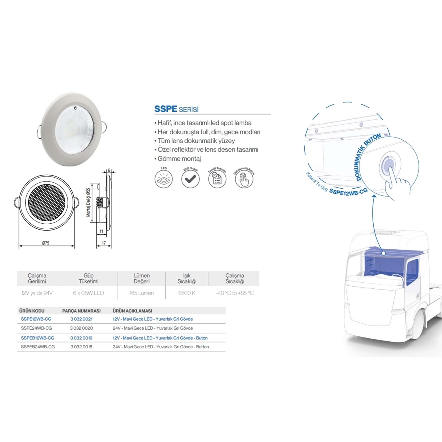 SSPE SPOT BUTONSUZ 12V BEYAZ AYD MAVIGECE YUV GRI