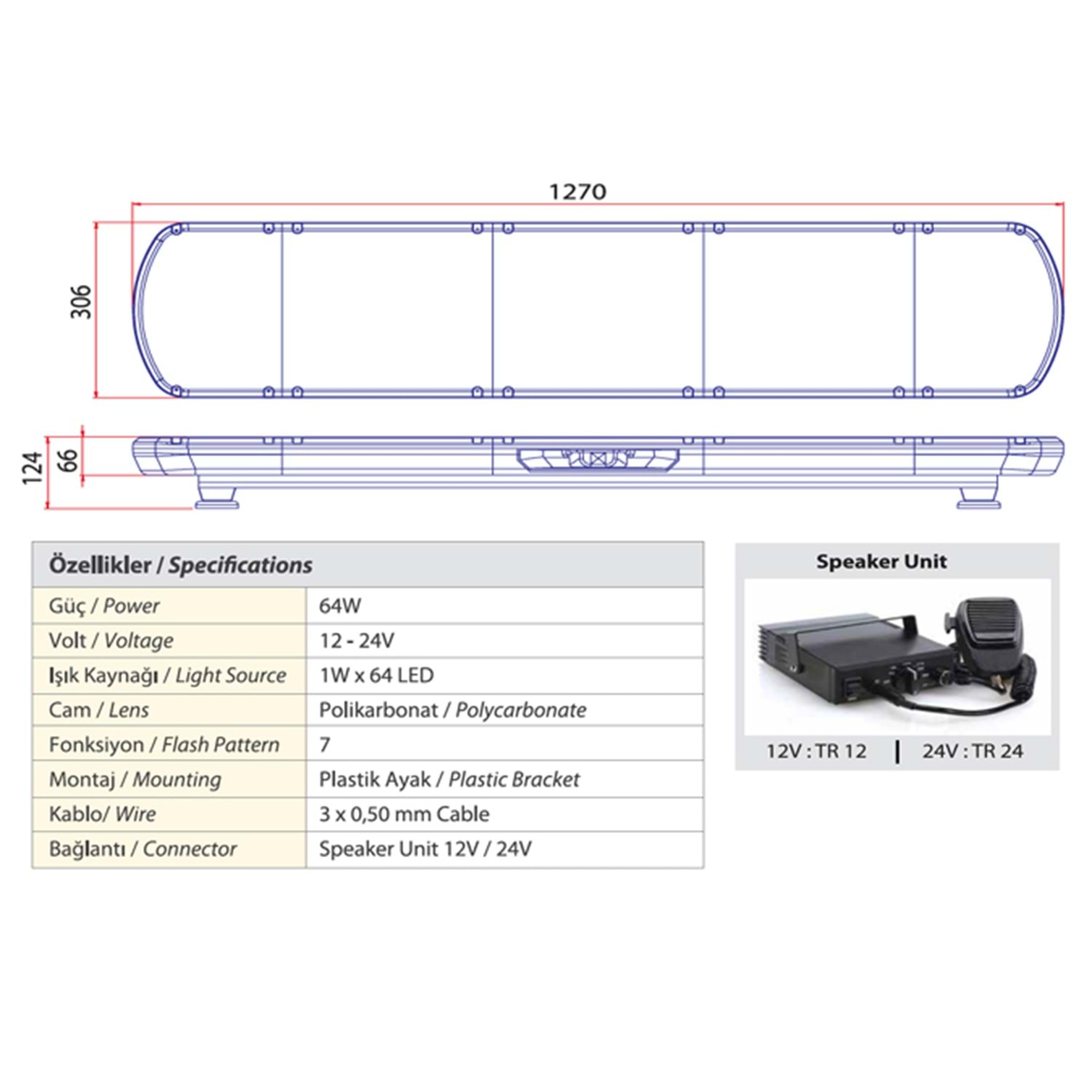 TRAFIK IKAZ LAMBASI LED SARI-KIRMIZI HOPARLORLU 127 CM KOMPLE SEFFAF