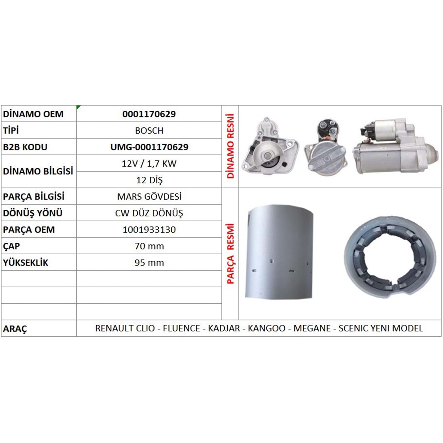 MARS GOVDESI (ORIJINAL) 12V 1,7 KW RENAULT CLIO - FLUENCE - KADJAR - KANGOO - MEGANE - SCENIC YENI MODEL