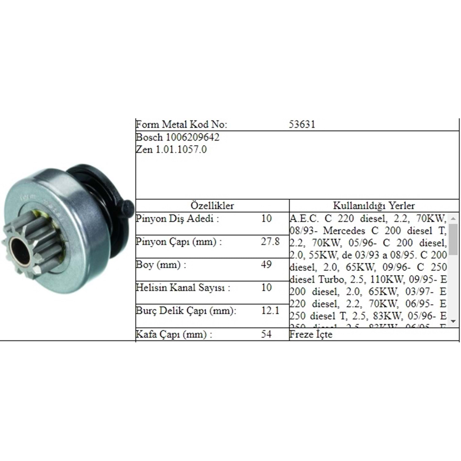 BOY 52,00 MM / KAFA ÇAPI 28,00 MM / İÇ ÇAPI 12,00 MM / KANAL 10 / 10 DİŞ