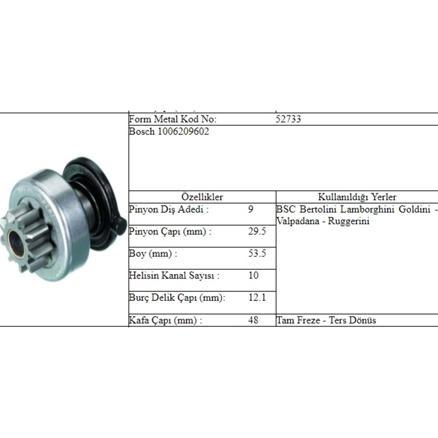 BOY 47,50 MM / KAFA ÇAPI 29,50 MM / İÇ ÇAPI 12,00 MM / KANAL 10 / 9 DİŞ / CCW