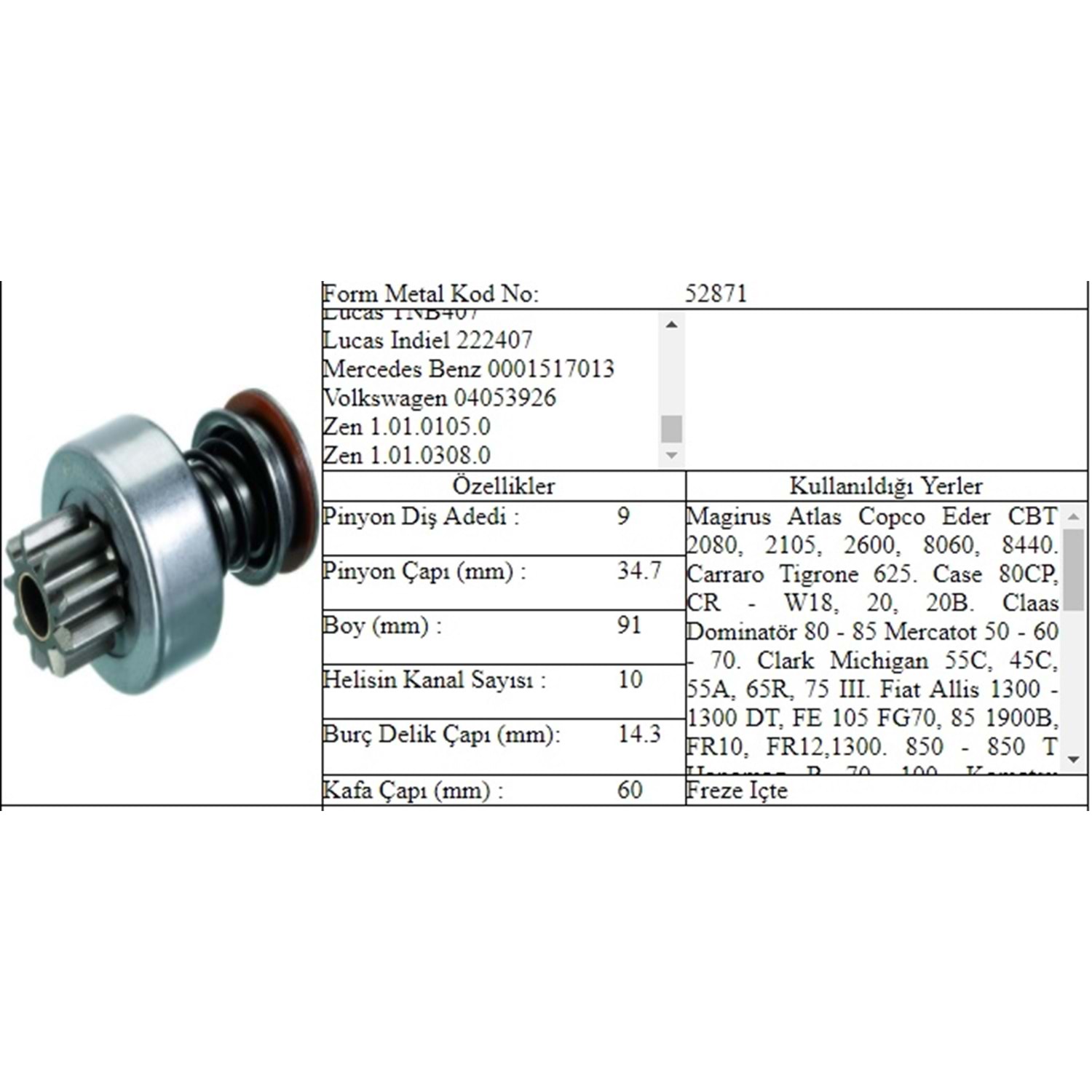 BOY 91,00 MM / KAFA ÇAPI 34,80 MM / İÇ ÇAPI 14,30 MM / KANAL 10 / 9 DİŞ