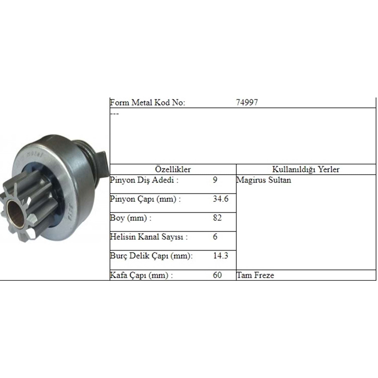 BOY 82,20 MM / KAFA ÇAPI 34,80 MM / İÇ ÇAPI 14,15 MM / KANAL 6 / 9 DİŞ