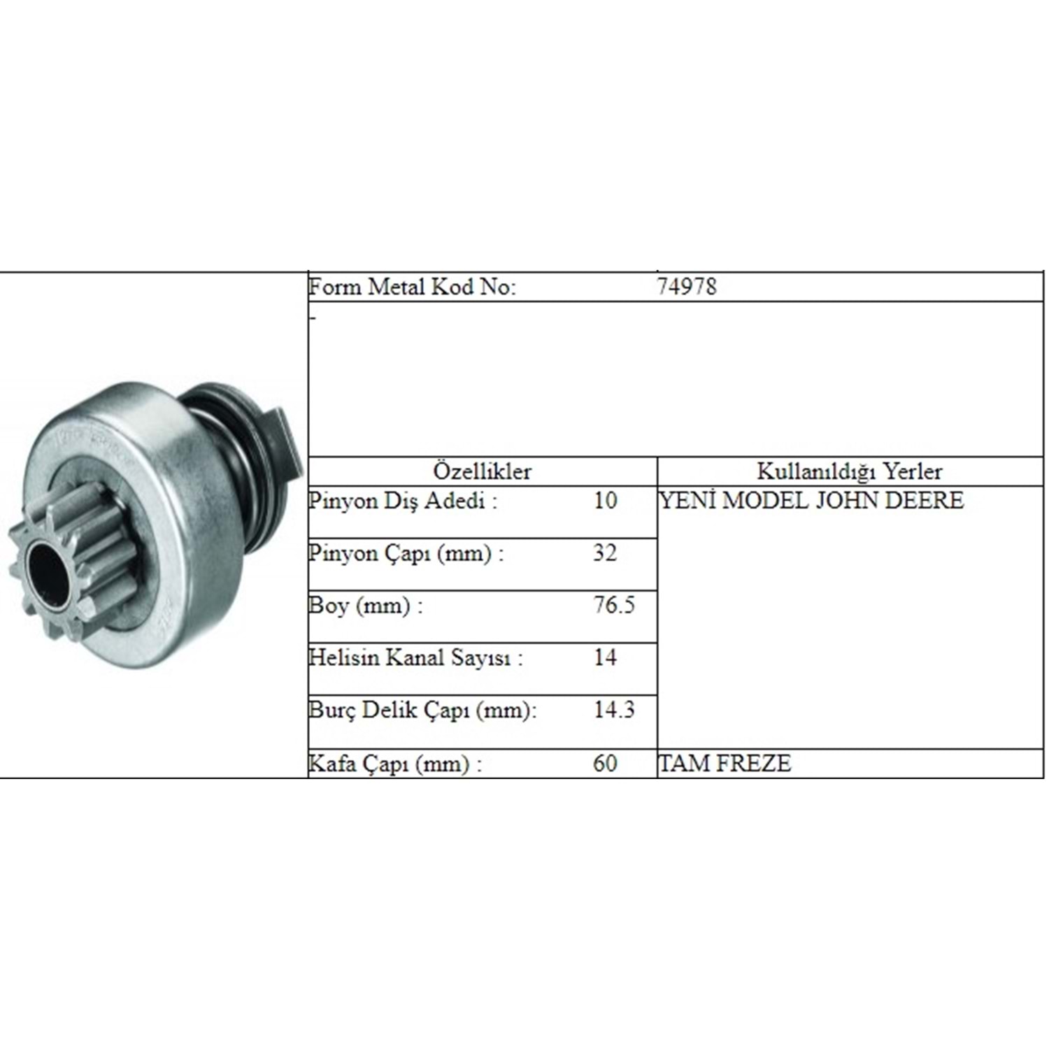 BOY 76,00 MM / ÇAP 62,00 MM / KAFA ÇAPI 32,00 MM / İÇ ÇAPI 14,00 MM / KANAL 14 / 10 DİŞ