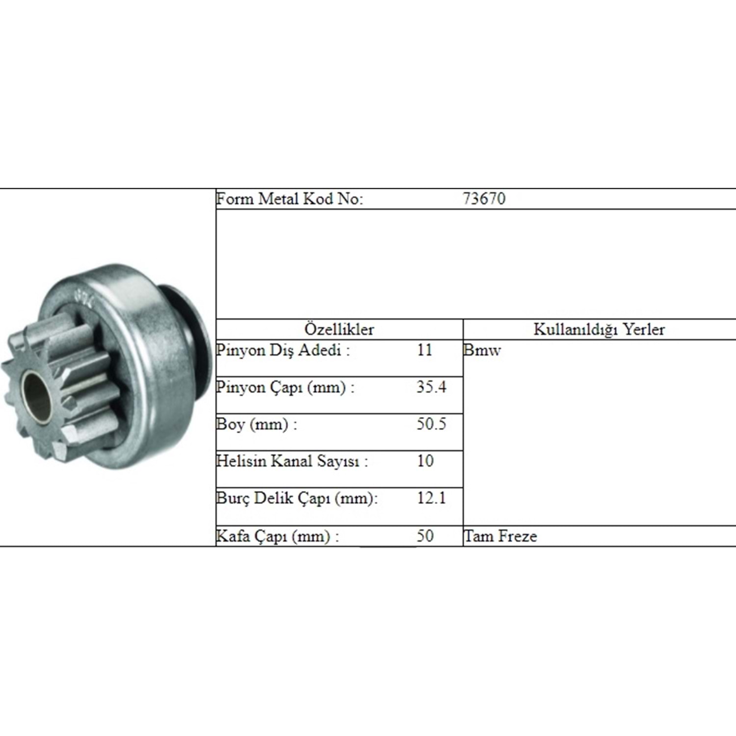 BOY 50,00 MM / ÇAP 47,00 MM / KAFA ÇAPI 35,00 MM / İÇ ÇAPI 12,00 MM / KANAL 10 / 11 DİŞ