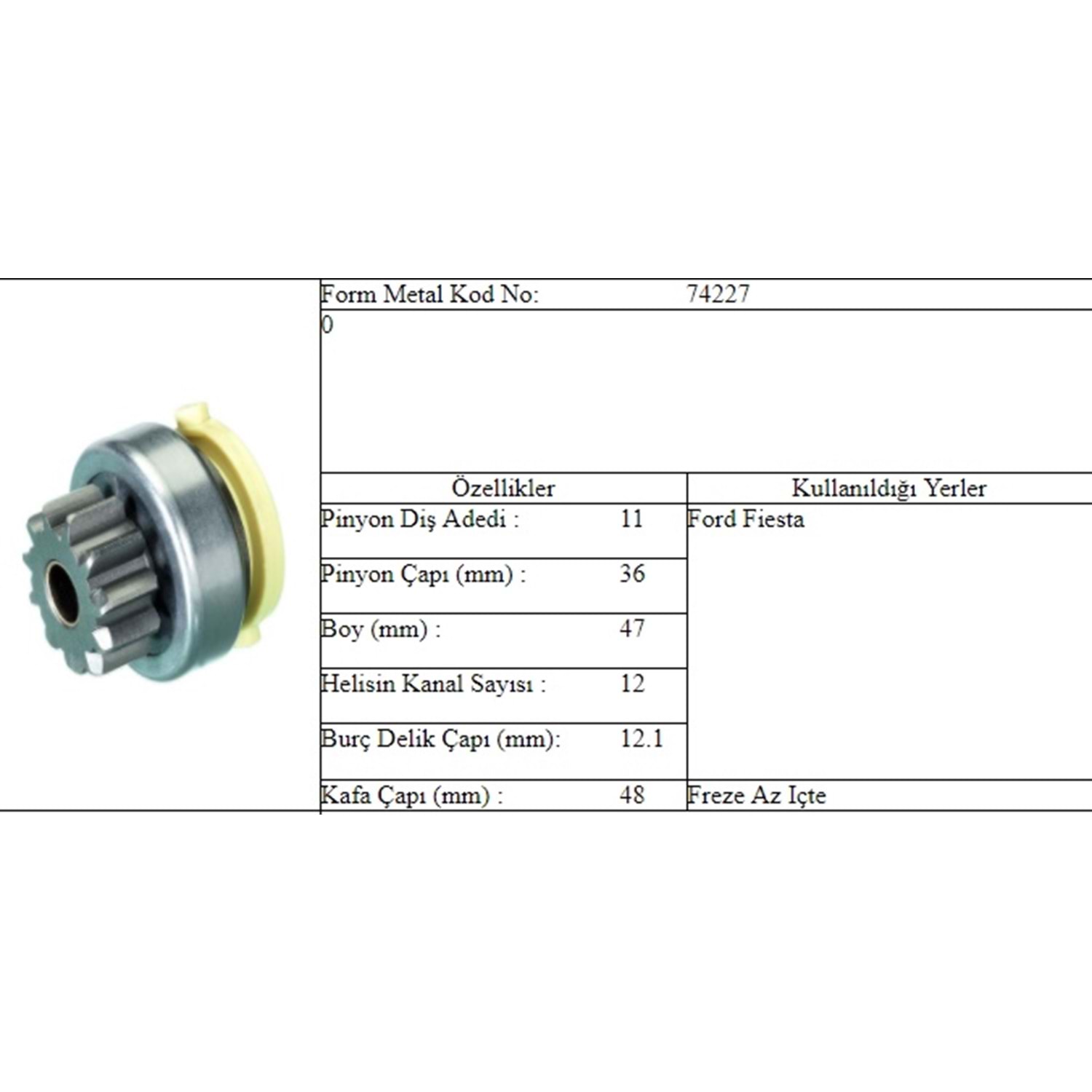 BOY 46,70 MM / KAFA ÇAPI 36,00 MM / İÇ ÇAPI 12,00 MM / KANAL 12 / 11 DİŞ