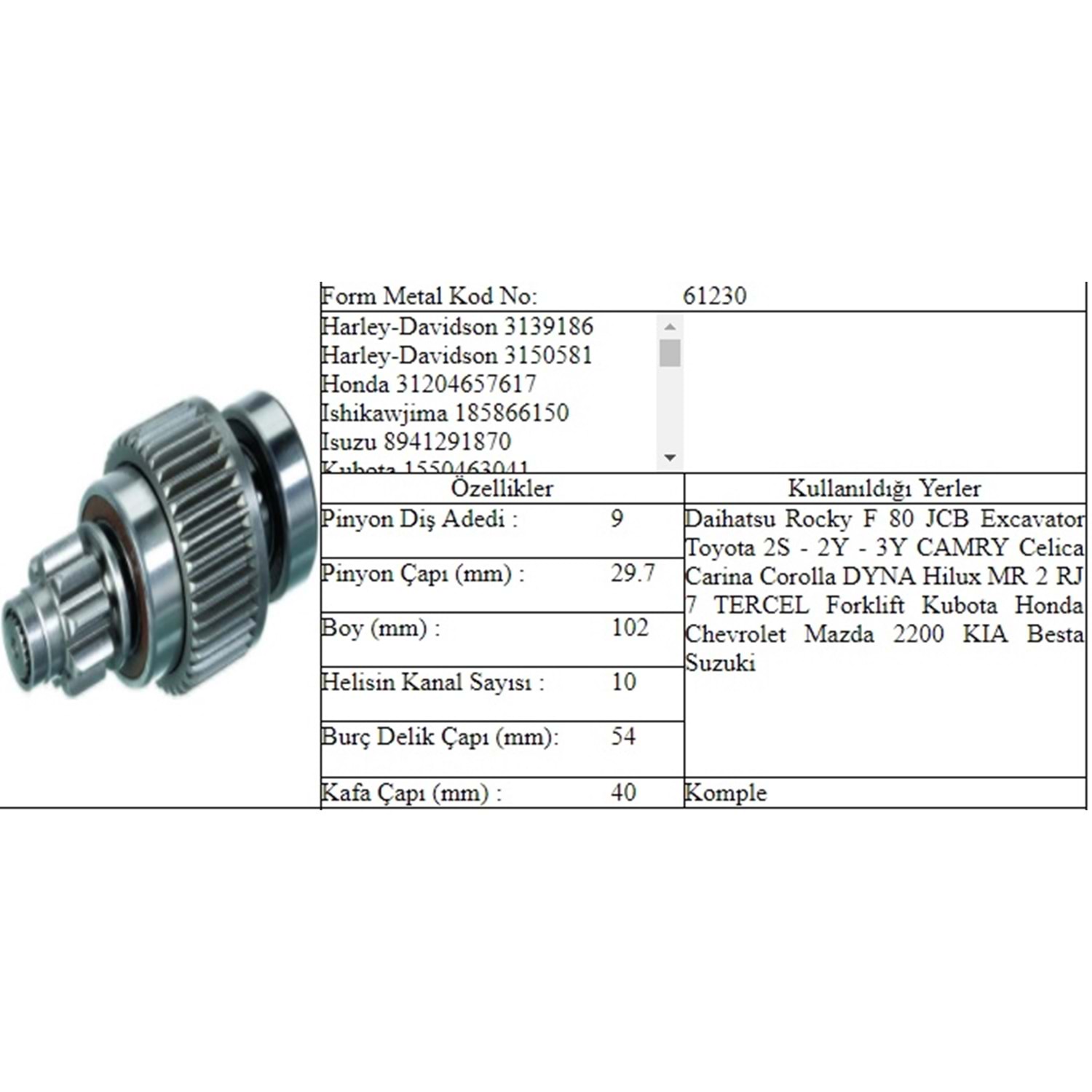 BOY 102,00 MM / KAFA ÇAPI 29,54 MM / GÖVDE ÇAPI 53,80 MM / 9 DİŞ