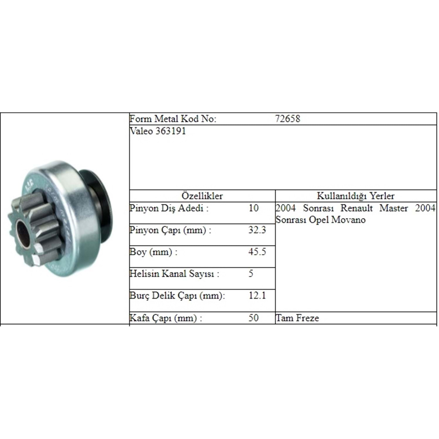 BOY 45,50 MM / KAFA ÇAPI 32,15 MM / İÇ ÇAPI 12,00 MM / KANAL 5 / 10 DİŞ